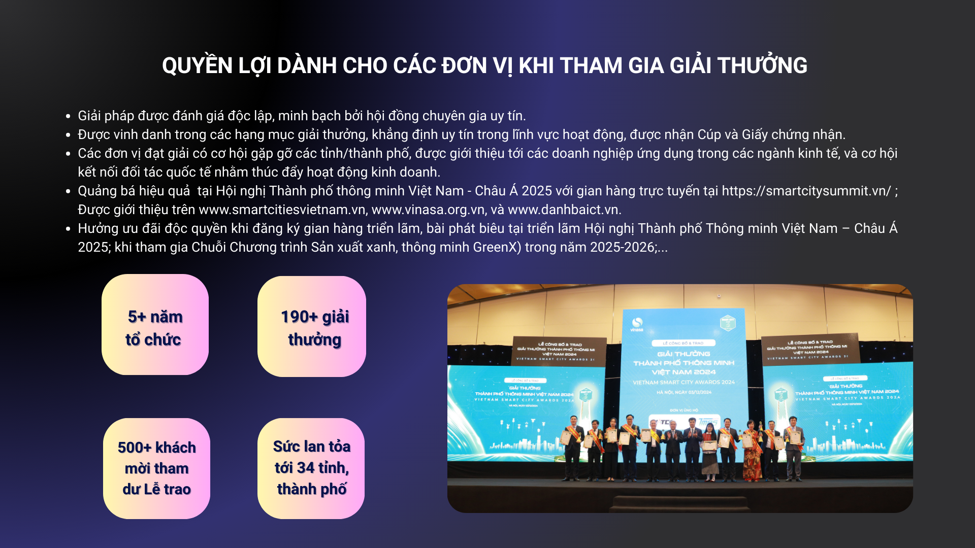 Giới thiệuChương trình Giải thưởng Thành phố thông minh Việt Nam do Hiệp hội Phần mềm và Dịch vụ CNTT Việt Nam (VINASA) tổ chức thường niên nhằm tôn vinh, ghi nhận những thành tích trong chuyển đổi số, xây dựng đô thị thông minh của các tỉnh/thành phố và khích lệ, cổ vũ các doanh nghiệp công nghệ đầu tư phát triển những giải pháp giúp các thành phố, đô thị trở nên thông minh hơn, mang lại tiện ích cho người dân.Nhóm 1: Giải thưởng Đô thị thông minh